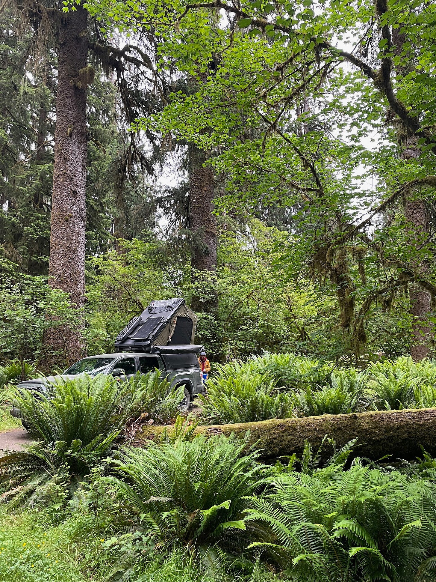 On our second day of exploring Olympic National Park and surrounding areas, we drove inland to the Hoh Rain Forest and set up camp in a truly magical spot amidst car-height ferns and mossy fallen trees.